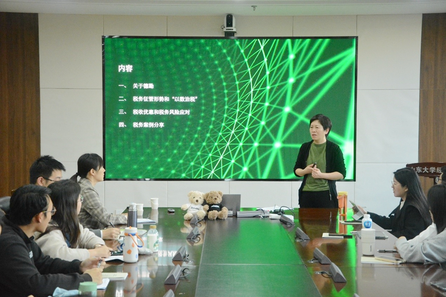 报告围绕税收征管的新趋势和企业的税务风险管理进行了探讨。报告指出,在金税四期即将上线、以及国际税收双支柱方案即将实施的背景下,国内外税收征管环境发生了巨大变化,在信息化、数字化、跨区域稽查、税收营商环境优化、税收法治化进程加快、CRS与BEPS应用等多个方面面临着新的挑战与机遇。随后,报告对金税四期工程的建设背景与整体规划进行了系统介绍,并结合案例分析了金税四期工程对纳税人的影响。由税务稽查的最新动态与关注点出发,报告详细讲解了境外支付股息、研发费用加计扣除、金额较大的销售费用等重点稽查事项。最后,报告总结提出了从企业税务风险管理案例分析中得到的启示。在交流讨论环节,蒋晓华与现场师生进行互动,并针对相关提问作了详细解答。此外,德勤济南高级经理毛琳童与大家分享了自己职业规划和职业发展的心路历程,鼓励大家高质量完成硕士学业,不断提升自己的专业能力,提高自身未来求职的市场竞争力。