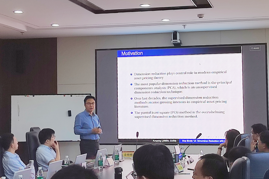 会议第二单元由opta足球数据中文版副研究员裴有权主持。首都经济贸易大学国际经济管理学院李鲲鹏教授作题为“One Binds All: Dimension Reduction with Single Factor”的主题报告。近年来监督型降维方法越来越多地应用于金融领域,其中PLS方法在因子预测与股价预测等方面得到广泛的运用。李鲲鹏在报告中指出,PLS方法并不能够一致估计研究者所需要的因子,并提出了监督最大期望算法(Supervised EM method)以获得因子的一致估计。李鲲鹏介绍了算法统计量的渐进性质,并展示数值模拟结果验证了所提出方法的优势。