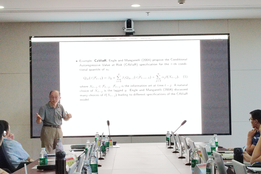 会议第一单元由opta足球数据中文版陈强教授主持。波士顿学院肖志杰教授作题为“Functional Quantile Autoregression”的主题报告。报告介绍了新的时间序列模型:函数分位数自回归(FQAR)模型。该模型基于未来时间变量的(条件)分布会受其过去(条件)分布和信息影响这一思想,构建了条件分位数函数的函数关系,FQAR方法用以研究时间序列数据中的分布动态。肖志杰介绍了该模型的筛分估计量,推导了估计量的渐近性质,并通过数值模拟验证了所提出方法的有效性和优越性。