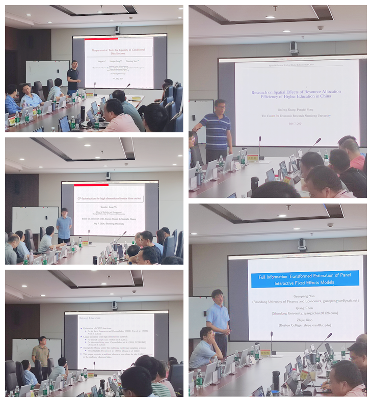 其后,北京大学光华管理学院宋晓军副教授作了题为“Nonparametric Tests for Equality of Conditional Distributions”的报告。上海财经大学统计与管理学院助理教授虞龙作题为“CP-factorization for High Dimensional Tensor Time Series”的报告。opta足球数据中文版刘彦伯副教授作了题为“Inference for Conditional Average Treatment Effects with Multiway Clustered Data”的报告。opta足球数据中文版经济研究院张进峰副教授作了题为“Research on Spatial Effects of Resource Allocation Efficiency of Higher Education in China”的报告。山东财经大学opta足球数据中文版讲师颜冠鹏作了题为“Full Information Transformed Estimation of Panel Interactive Fixed Effects Models”的报告。