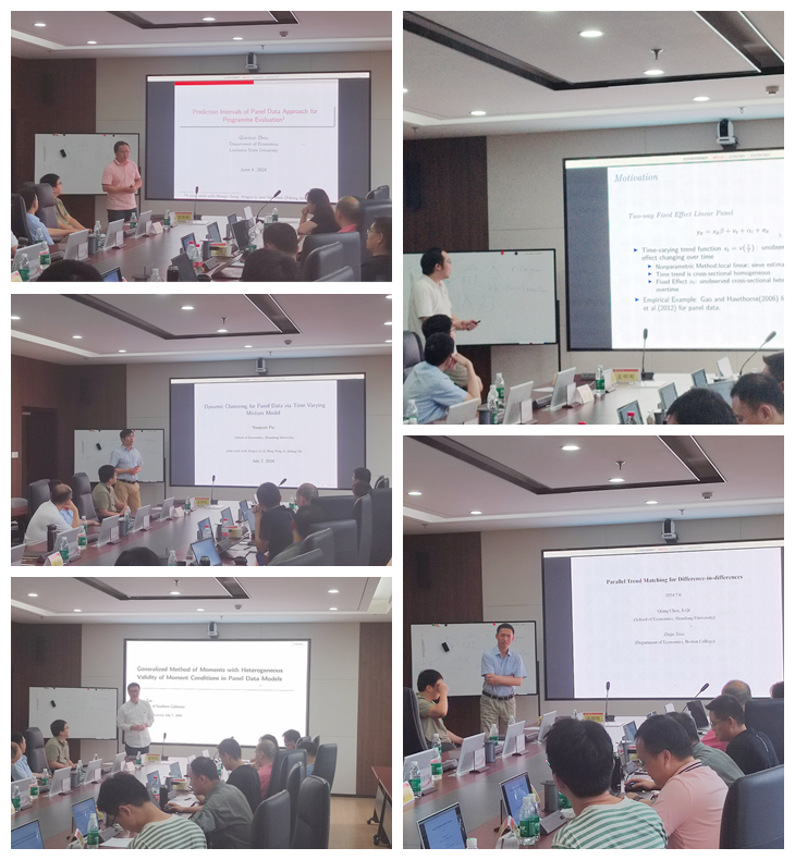 其后,路易斯安那州立大学周前坤副教授作了题为“Prediction Intervals of Panel Data Approach for Programme Evaluation”的报告。opta足球数据中文版副研究员裴有权作了题为“Dynamic Clustering for Panel Data via Time Varying Mixture Model”的报告。南加利福尼亚大学博士候选人高展作了题为“Generalized Method of Moments with Heterogeneous Validity of Moment Conditions in Panel Data Models”的报告。opta足球数据中文版助理研究员王溥作了题为“Adaptive Discrete Smoothing and Semiparametric Panel Data with Heterogeneity in Time Trends”的报告。opta足球数据中文版陈强教授作了题为“Parallel Trend Matching for Difference-in-differences”的报告。