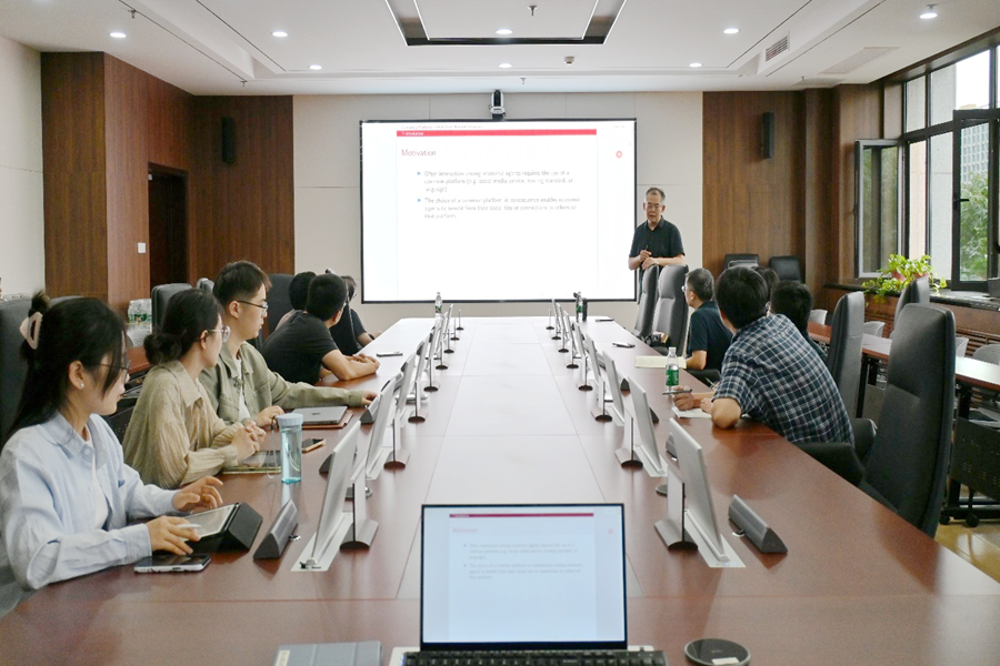 报告研究了一个非合作的多层网络形成模型,其中参与者必须在两个平台(层)中进行选择,或是以付出额外成本为代价对二者都做出选择;玩家可能只会与同一平台上的其他玩家建立高成本链接,从而使玩家能够获得信息等非竞争利益。报告使用该模型检验了多个平台可能共存的条件,并研究由此产生的网络特征。最终发现,如果一些玩家发现使用多个平台是值得的,并将利益传递给只使用一个平台的参与者,平台之间就可以实现共存。此外,通过研究随机的近视最佳响应,报告强调这种共存也可能长期持续,并进一步探讨了如信息传递中的摩擦和异质性偏好等扩展情形。在报告过程中,崔志伟教授同与会师生就模型假设等相关问题进行了充分的探讨。