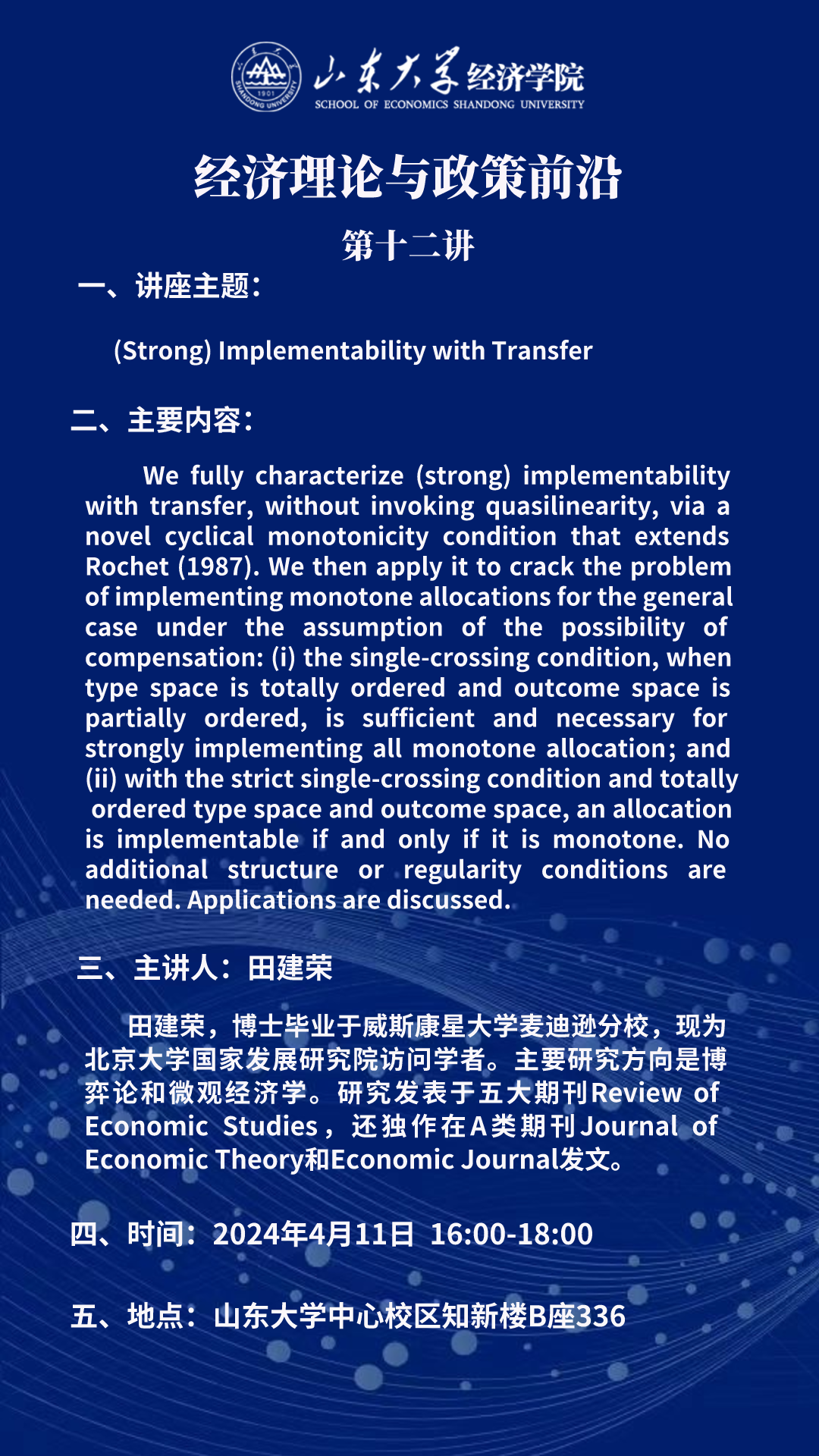 (Strong) lmplementability with Transfer(经济理论与政策前沿第十二讲)