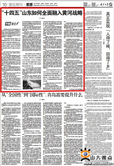 文章分析指出,需要充分认识“十四五”山东全面黄河战略对山东发展的重大意义。黄河战略的范围,涵盖了京津冀协同发展、长江经济带等原有国家发展战略未覆盖的区域,有助于实现国家区域发展战略的地理全覆盖,也使山东在国家发展战略版图中的地位更加凸显。需要突破行政区划的局限谋划发展大局。黄河战略为山东发展提供了更加广阔的空间和舞台,沿黄一直往西,可形成巨大的战略纵深;向东可进一步深化与日韩的合作。其中的关键是突破行政区划的局限,以区域、全国、东亚思维去谋划发展大局。需要在黄河流域做好区域大循环的文章。以优势互补为抓手,充分发挥山东的资源禀赋、工农业基础等比较优势,通过建设不同层级、不同主题的样板区、合作区,以点带面推进黄河流域整体发展。