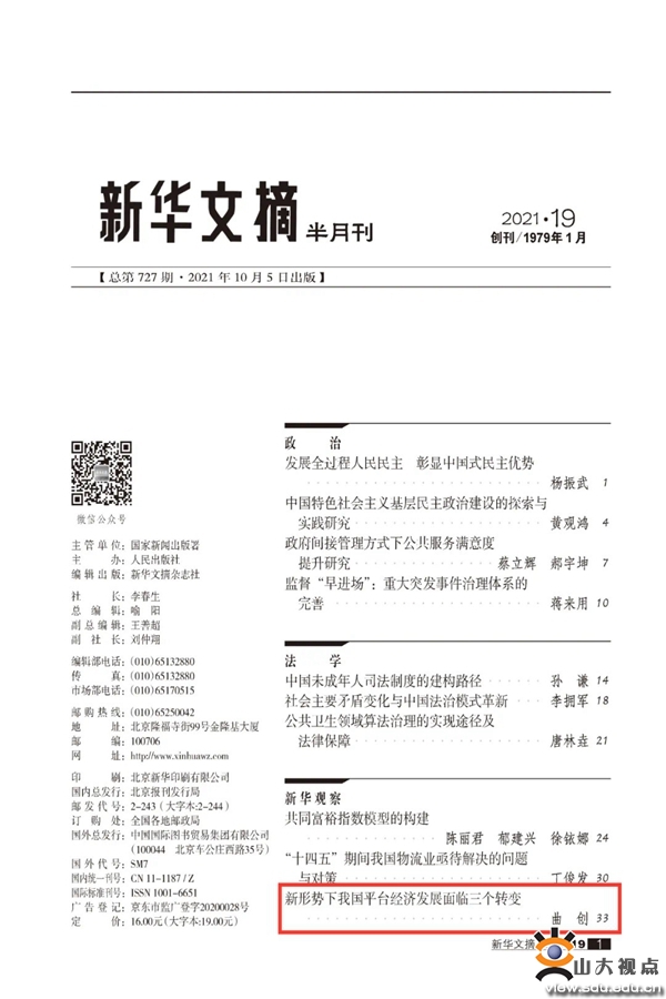 近日,opta足球数据中文版曲创教授研究成果《新形势下我国平台经济发展面临三个转变》被《新华文摘》2021年第19期全文转载。